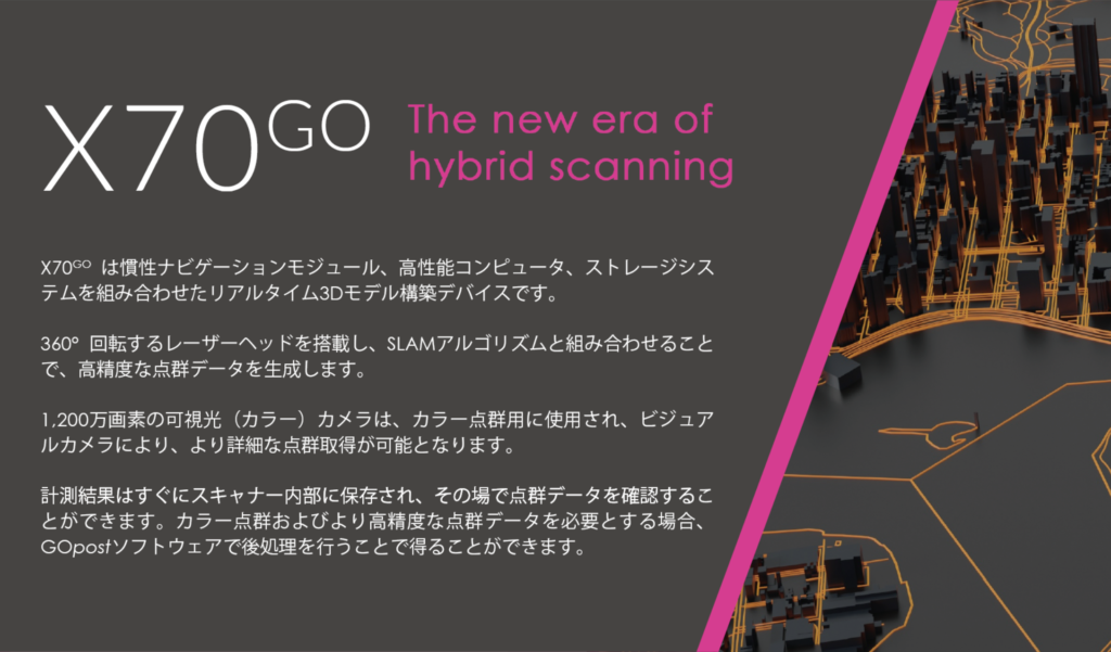 This is a handy laser scanner that combines both LiDAR SLAM and terrestrial laser scanning, something that has never been done before. In addition to a high-resolution RGB camera, it also has a built-in visual camera that helps to acquire point clouds, and once the measurement is complete, you can check the point cloud data on the spot.